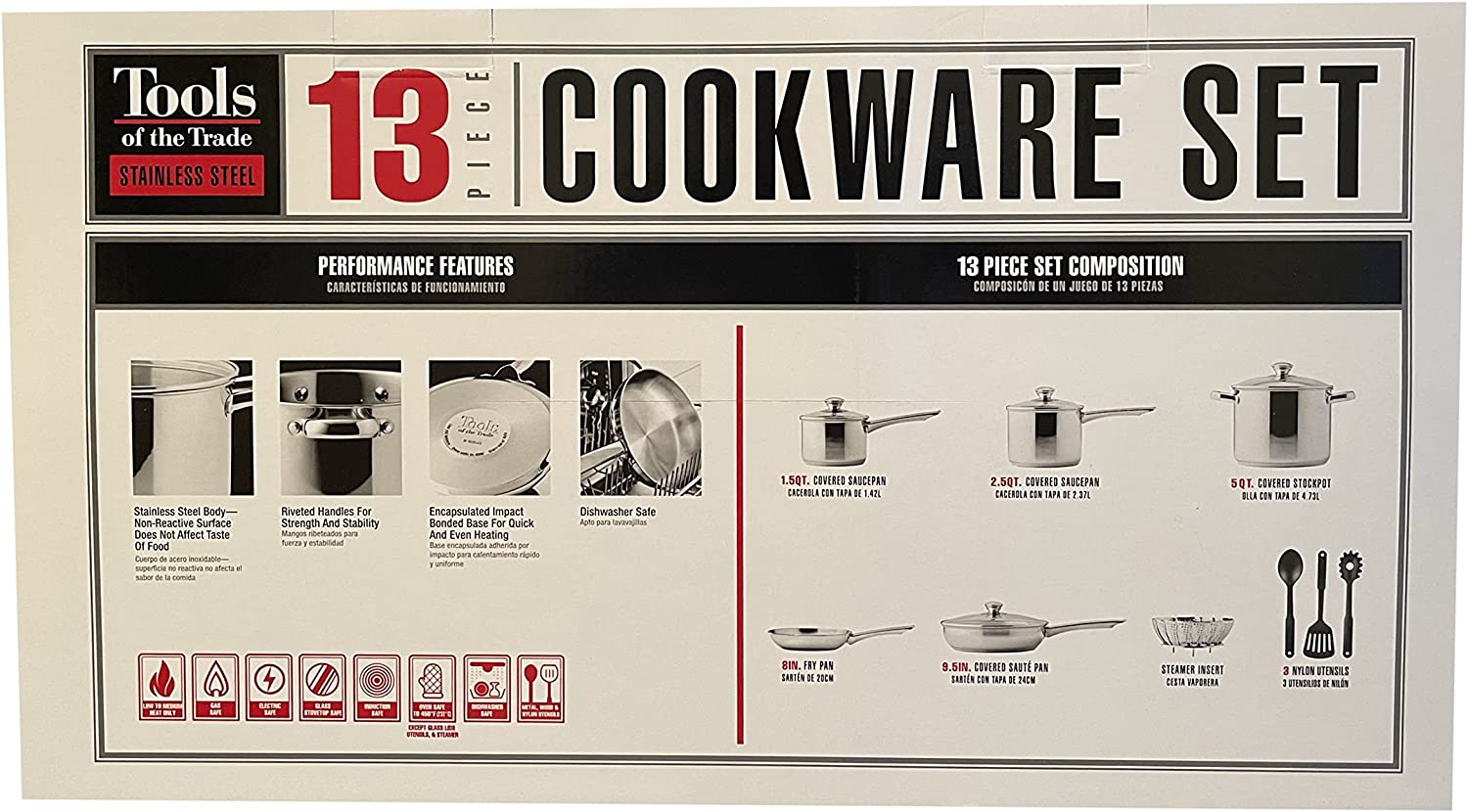 Product Details Get your kitchen off to a great start with this stainless steel cookware set from Tools of the Trade. The 13 pieces include the basics you will use most plus utensils and a steamer.
