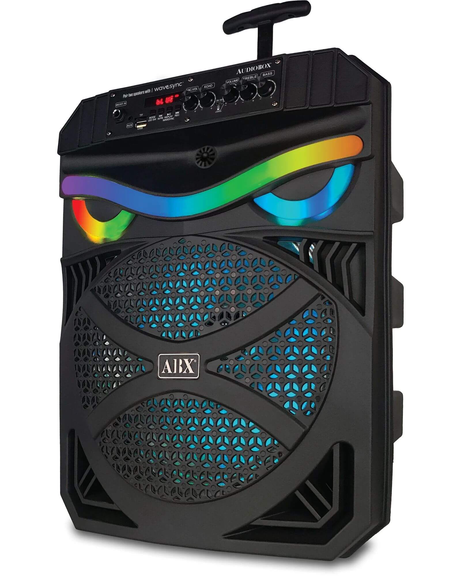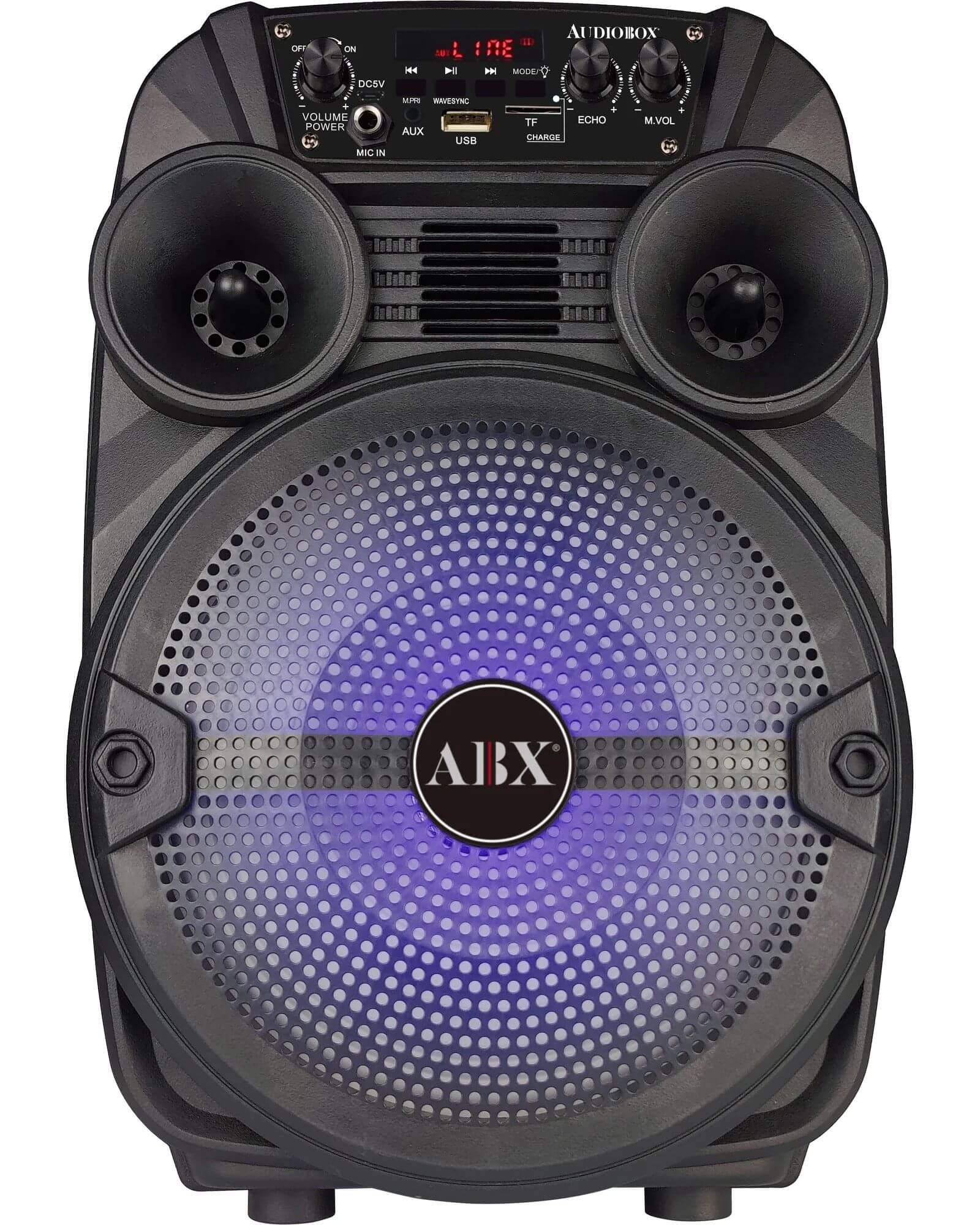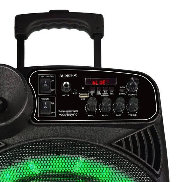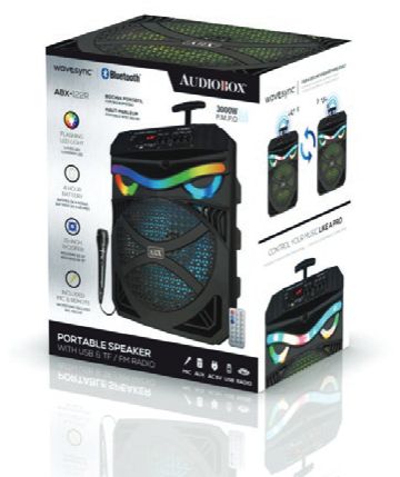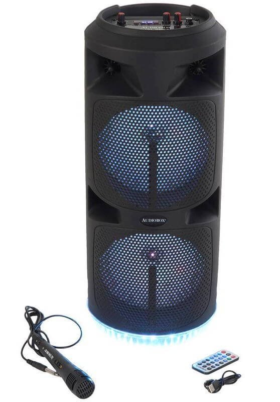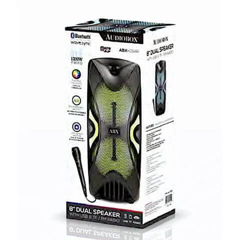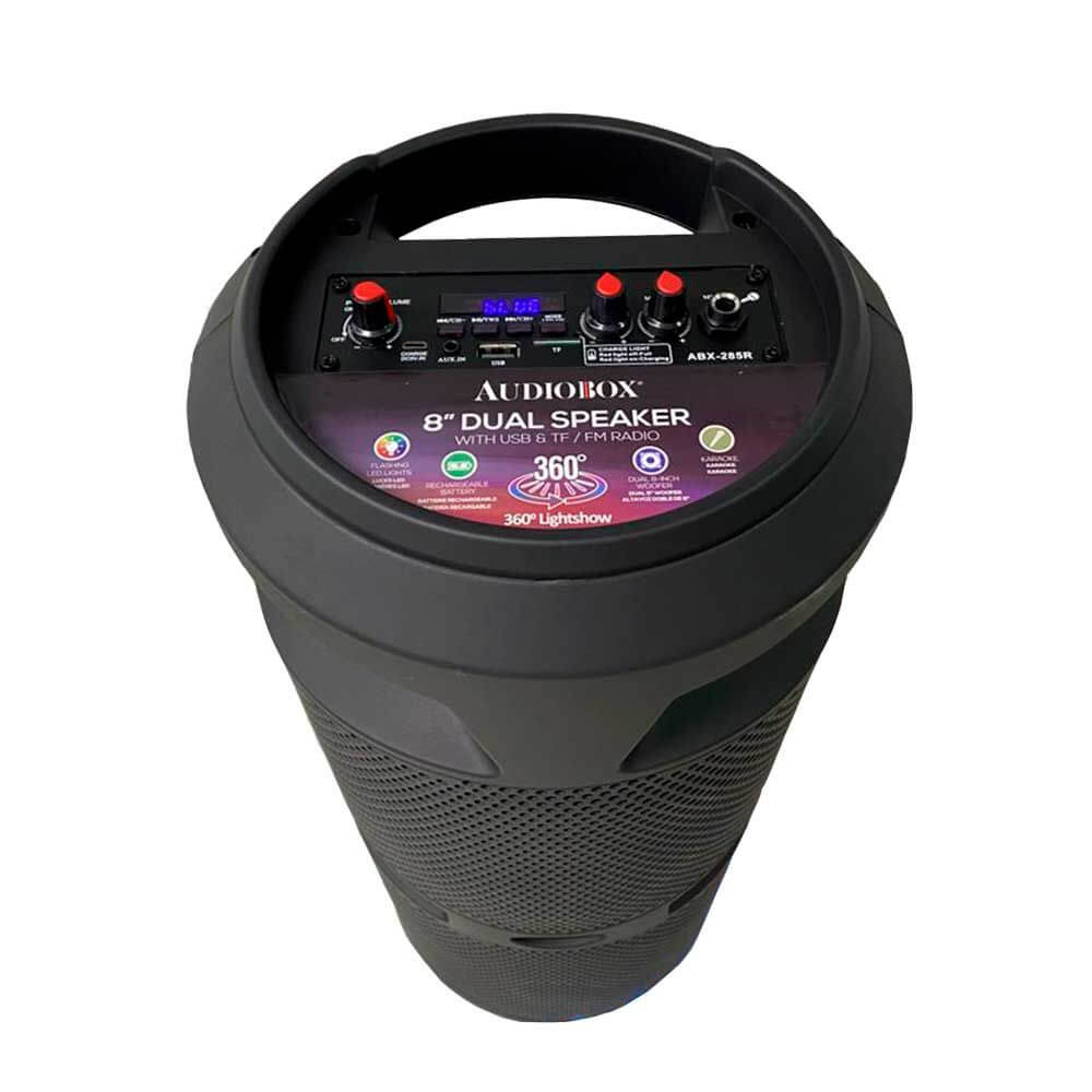 The ABX-285R Bluetooth Rechargeable Speaker from Audiobox packs a whole lot of party entertainment into its 23 in. tall tower. Dual 8 in woofers pump out up to 1,200 watts of musical power! 360deg light effects and included wired 1 4 in. microphone means you can add excitement to your own singalongs. Other inputs include Bluetooth streaming, FM radio, 3.5 mm aux for non-Bluetooth devices, and USB microSD Card slots for your own media with MP3 files.