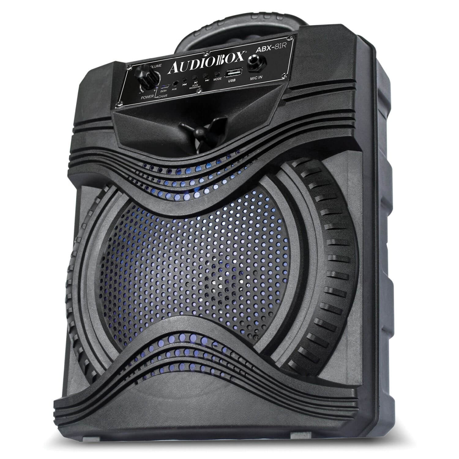 The Audiobox 8-Inch Portable PA Speaker features an 8 in. driver for solid sound performance. The built-in rechargeable battery keeps the party going all day long. Once the sun sets, light the night with the 7-color woofer light show. Wirelessly stream music from any Bluetooth source, downloads on USB/SD media, or the built-in FM tuner. Sing along or use the speaker as a PA system with the 1/4 in. microphone input. It boasts a compact design for easy portability, and a wired microphone included.