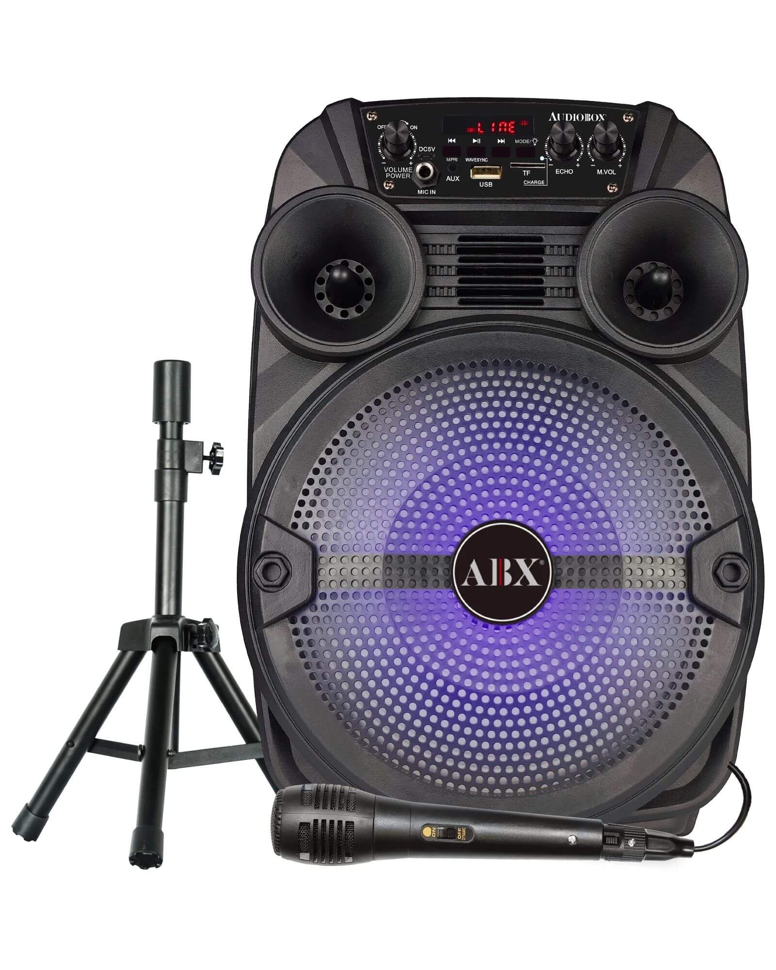 Come ready to impress your friends at your next gig with quality sound and power with the AudioBox 15 Inch PA Bluetooth Speaker. Sing and gather around this speaker belting your favorite tunes with powerful sound and included accessories. The speaker includes the latest generation of Bluetooth allowing you to play music from up to 20 feet away without cables and is compatible with all Bluetooth devices such as iPhones, Androids, and Laptops. Create a stunning multicolor light show with a flip of the switch on the rear panel, multicolor sound-activated lights will turn on and change color.
