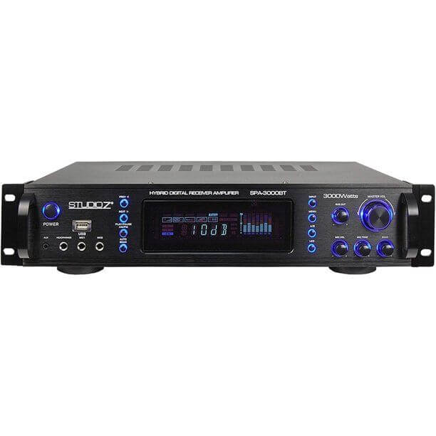Listen to music and audio at home by connecting the Studio Z Digital Hybrid Radio Receiver and Amplifier to your sound system. Control the volume and sound levels for your speakers, play music from connected devices, listen to the radio, or amply microphone input with this all-in-1 home audio device. This receiver and amplifier combo lets you listen to music from almost any input. The home sound system amp features Bluetooth (2) 0.25-inch microphone inputs, (1) USB port, (1) aux cord jack, and (1) SD card slot. You can also listen to radio thanks to the digital tuner. Enjoy both AM and FM radio with convenient station scanning to find stations, and an auto station store function that makes it easier to find your favorite stations again.