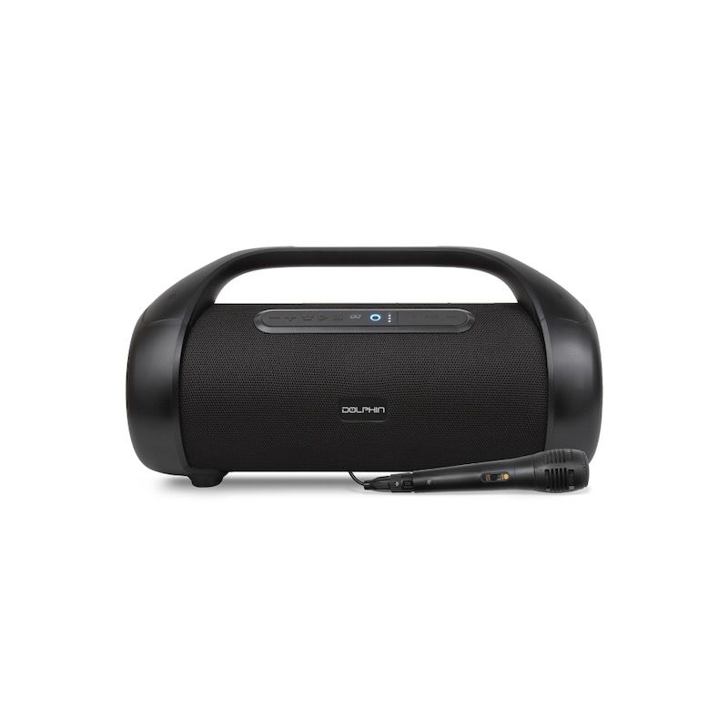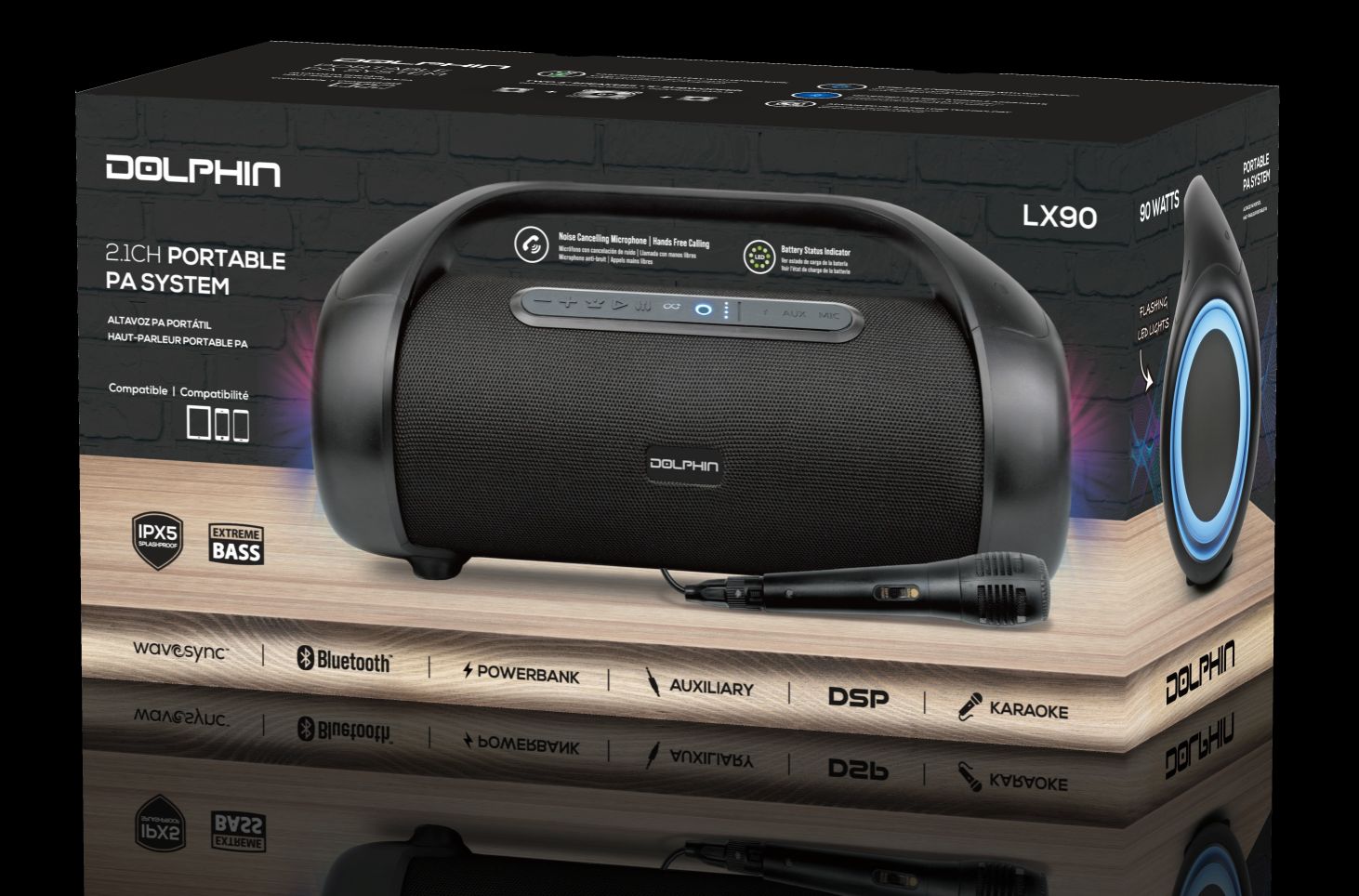 This IPX5 rated speaker is equipped with WaveSync™ Technology, wirelessly pair two speakers and play music through Bluetooth. Optimized for Siri and Google Assistant with a noise cancelling microphone for hands free use. The 5? woofer and dual 3? tweeters for a soft and punchy base. With multicolour changing diaphragm lights, and LED battery indicator, the LX90 is accessories also include a wired karaoke microphone and USB-C charging cable.