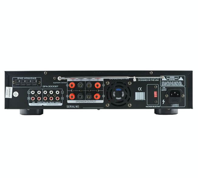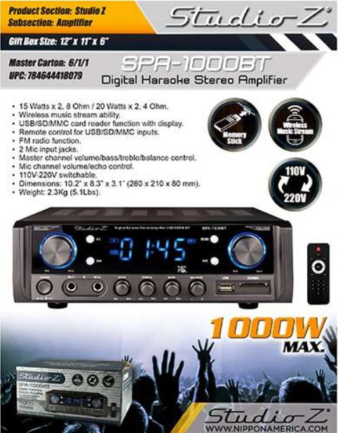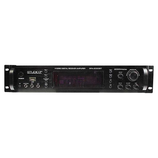 Studio z hybrid digital receiver amplifier – 5000 wattsproduct number: spa-5000bt180w x 2, 8 ohm / 250w x 2, 4 ohmam/fm quartz synthesized tuneauto station seek and store ( 60 radio station storage)full function remote controlipod/mp3 input with cable (3.5mm to 3.5mm cable, white)usb reader functioninputs: rca (2 audio sources)outputs: banana binding post1 rca dedicated for record line output2 mono rca dedicated for subwoofer output1 rca dedicated for preamp outputseparate gain control for preamp and subwooferdigital fluorescent output display meterremovable rack-mount brackets110v-220v switchable