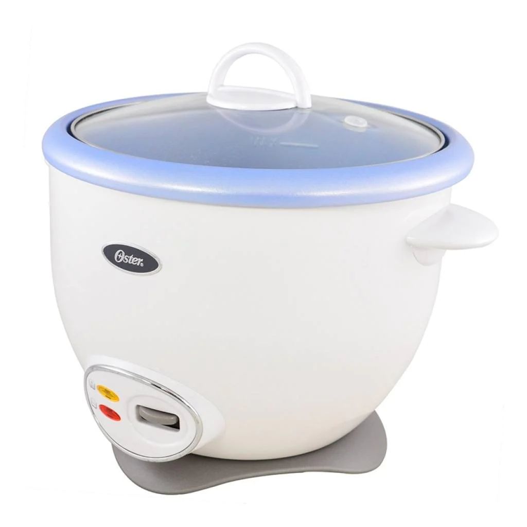 Oster 4729-053 Rice Cooker with 10 Cup Capacity, Glass Lid, Heating Body and Keep Warm Light. Removable, dishwasher-safe inner bowl and cord for convenient cleaning and storage. Includes measuring cup and paddle