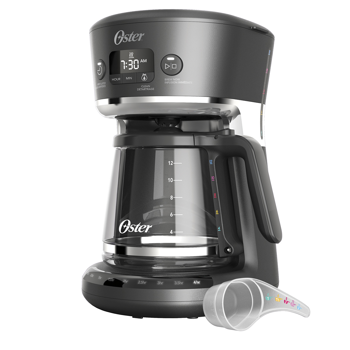 Enjoy great coffee simply made with the new Oster® Easy Measure Coffeemaker that provides you with an easy to use coffeemaker that makes consistently better tasting coffee. The Oster® Easy Measure Coffeemaker features an easy colour-coded measuring system on the scoop, carafe and water reservoir, making it simple to add the right amount of coffee grounds and water every time. It also includes a 2-step Advanced Water Filtration System that improves taste by removing impurities in water and an Illuminated 4-Hour Freshness Indicator that tells you how long it’s been since the coffee was brewed.