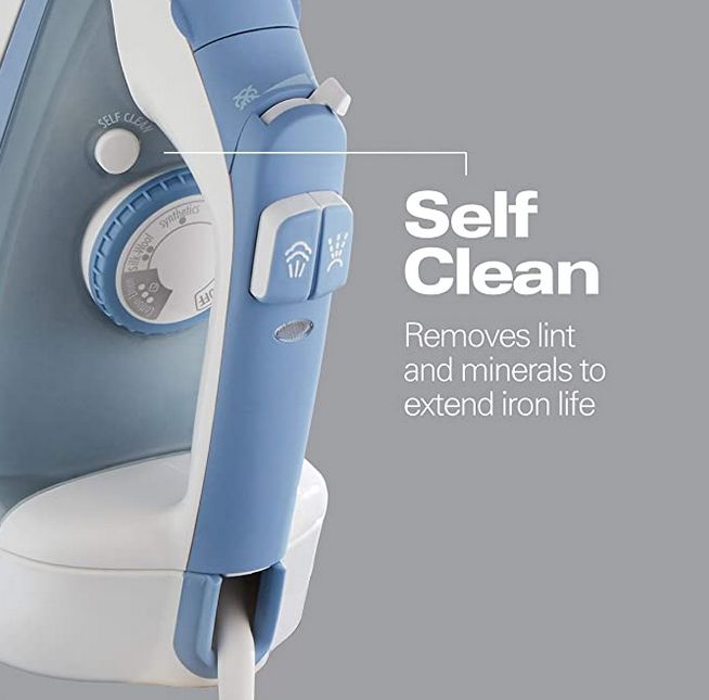 Full-Size Iron has a non-stick soleplate which is 10 times more durable and allows for superior glide performance. This iron has an adjustable steam blast and fine-mist spray. It features an automatic shutoff, which shuts off in 30 seconds if the iron rests on its face or side, or it shuts off in 15 minutes if it rests on its heel. It also has a hot dot indicator which lets users know when the iron is cool enough for storage.