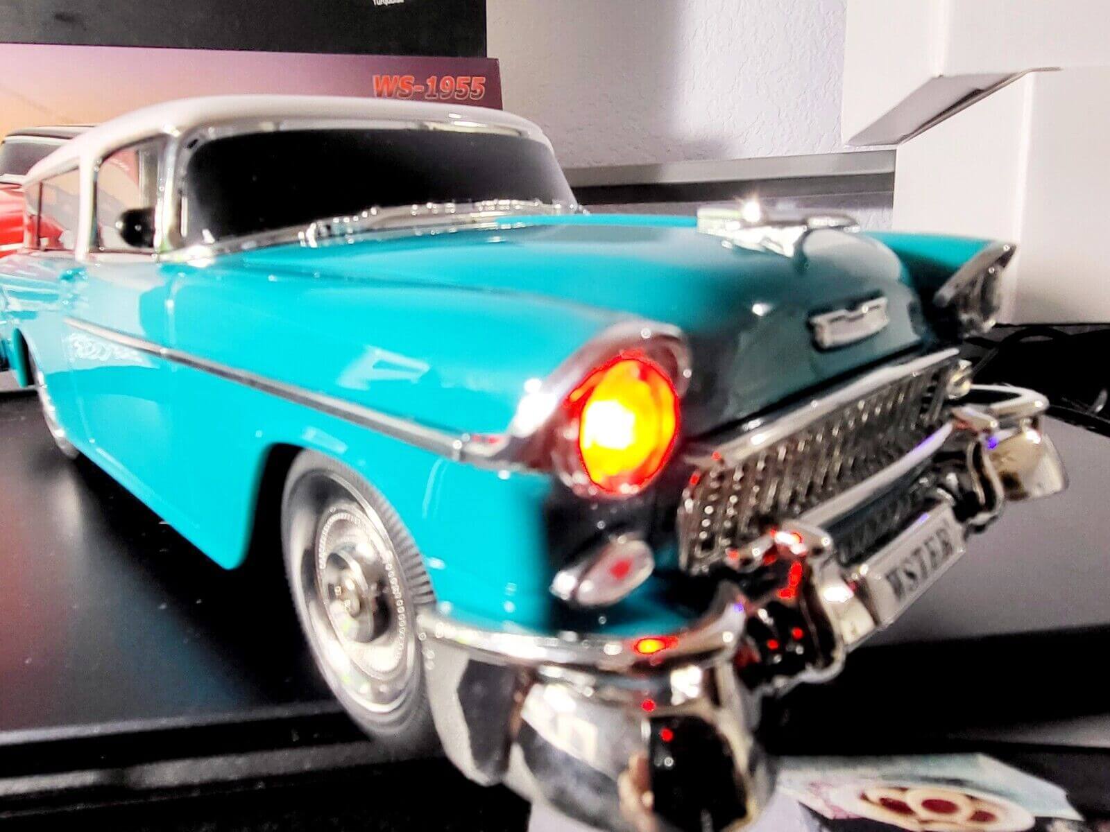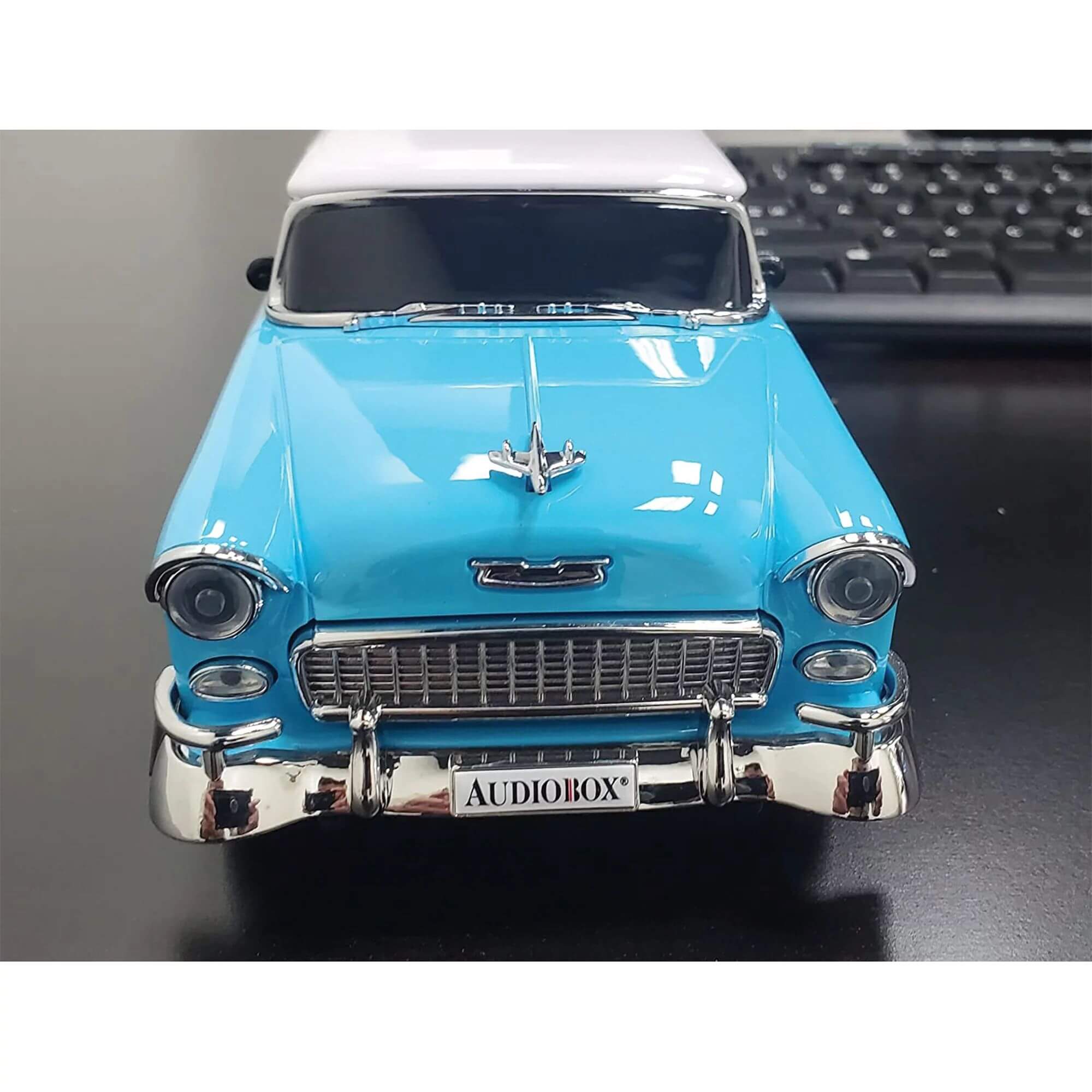 Rev up your tunes with the Retro Ride 1955 Replica Car Speaker in Blue. With its vintage car style design, this speaker is ideal for anyone who loves classic style. The rechargeable battery and USB-C charging port make it convenient and easy to use, while the WaveSync technology allows you to connect multiple speakers for a surround sound experience. You can easily connect a number of audio sources through Bluetooth, USB, microSD Card, 3.5 mm aux, and its built-in FM radio receiver. With a built-in 1,200 mAh 3.7-volt Li-Ion battery and included USB-C charge cable, this retro speaker is ready for a road trip.
