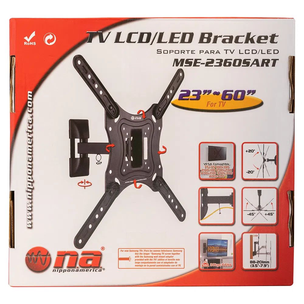 Don’t sacrifice your comfort to get the perfect viewing angle. Customize your viewing pleasure with Nippon America Fixed TV Bracket Wall Mount. Built for flat screen televisions from 32 to 60 inches wide, this wall mount is perfect for at home or in your RV. This floating TV stand is designed to mount flat panel televisions and monitors with VESA (Video Electronics Standards Association) hole patterns up to 400mm x 400mm and that weigh up to 88 pounds. It mounts to a vertical surface or wall. This unique flat screen TV mount offers full-motion viewing options. This flat panel TV mount swivels your television up to 12 degrees of tilt (may vary with size of television or installed position). Save space on your entertainment system and mount your television to the wall with help from Nippon America TV Bracket.