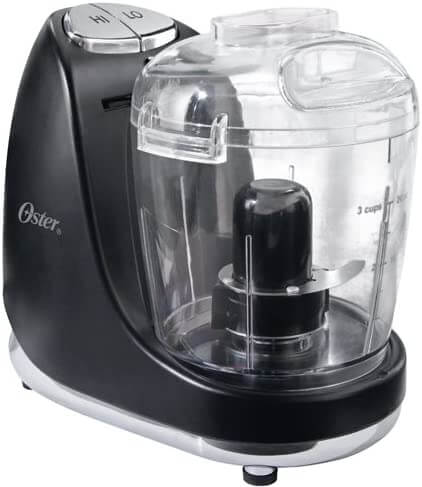 Whether you want to chop, slice or dice vegetables, the Oster 3-Cup Mini Chopper in black does it for you in minutes. Powered by a 150-watt motor, this mini chopper has a 3-cup-capacity work bowl with a sharp S-shaped stainless-steel blade that chops, slices, dices, purees and more. Choose between the two speeds - Hi and Low - depending on your needs. You may use this mini vegetable chopper for anything from chopping vegetables for a homemade pizza to pureeing garbanzo beans and garlic for a hummus spread.