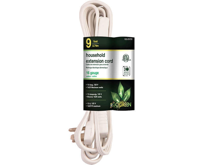GoGreen power 16/2 9’ household extension cord, 3 outlets, White, 9 Ft