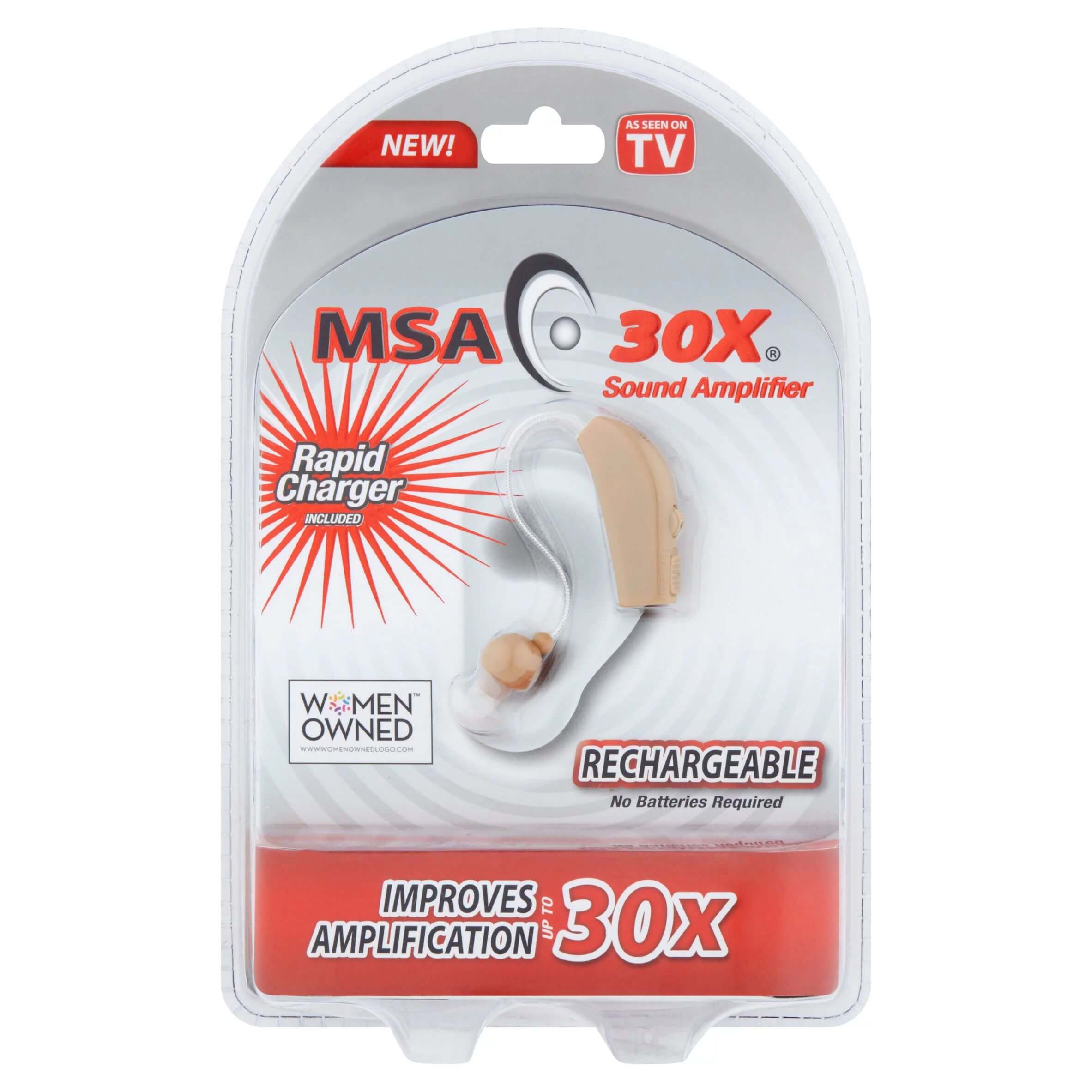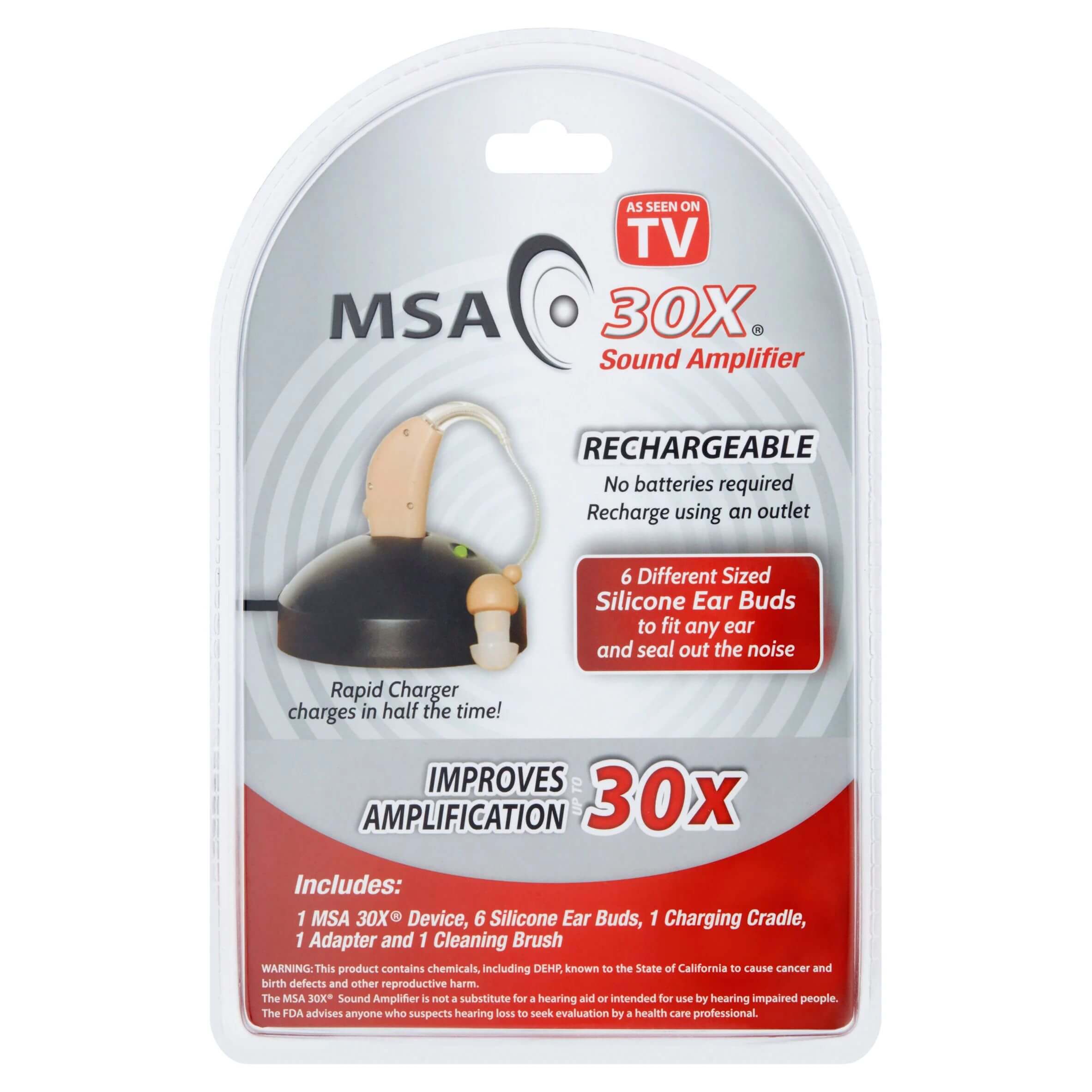 Sound Amplifier 1 amplifier As seen on TV. Includes, 1 MSA 30X device, 6 silicone earbuds, 1 charging cradle, 1 adapter, and 1 cleaning brush. Rapid charger included. Rechargeable. No batteries required. Improves amplification up to 30x. Includes 6 different sized silicone earbuds to fit any ear and seal out the noise. Rechargeable. No batteries required. Recharge using an outlet. 6 different sized silicone earbuds to fit any ear and seal out the noise. Rapid charger charges in half the time! The MSA 30X Sound Amplifier is not a substitute for a hearing aid or intended for use by hearing-impaired people. Microprocessor technology. Comfortable.