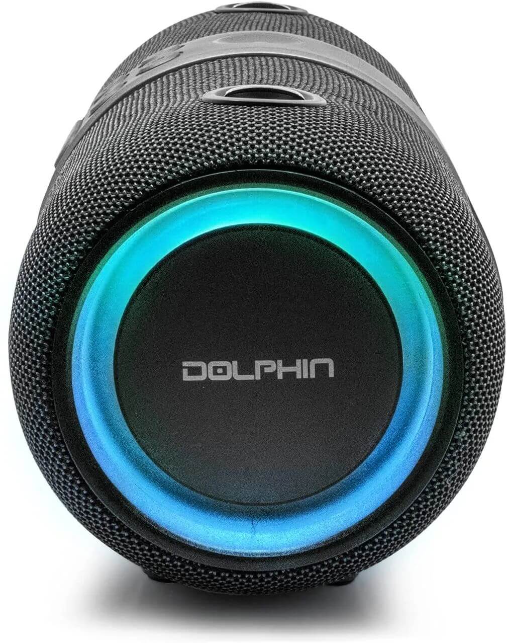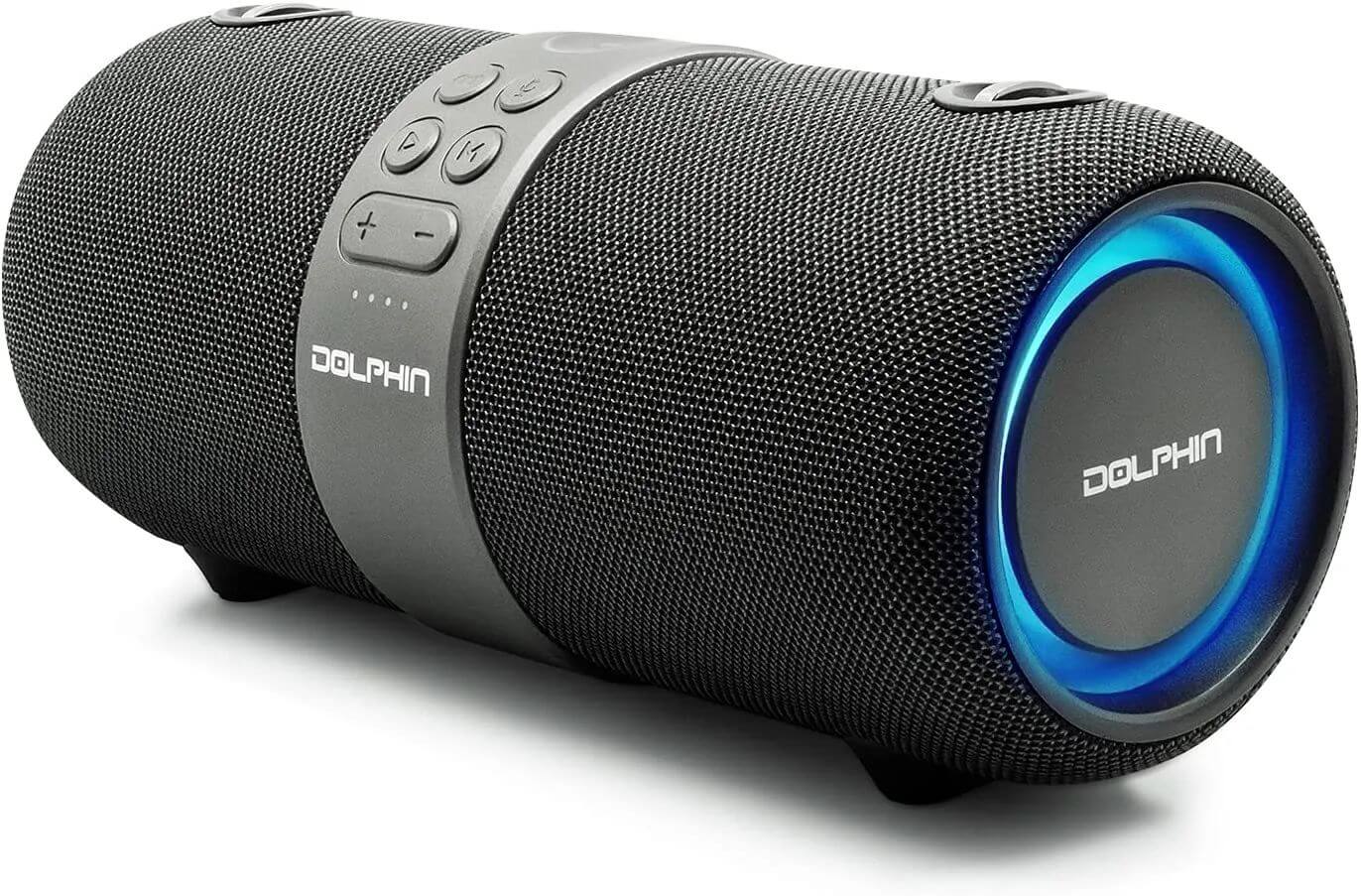 The Dolphin Audio Waterproof Boombox with DSP provides big sound for people on the go! Stream music via the Bluetooth connection, play digital downloads from the USB and SD Card inputs, or go old school and listen to the built-in FM tuner. Featuring dual 3 in. passive radiators and 30 watts of total power, it offers premium sound performance. Sound activated color changing accents lights keeps the party going at night. Connect 2 speakers together with the Wave Sync technology for even more sound. A shoulder strap, AC cable, and auxiliary cable are included.