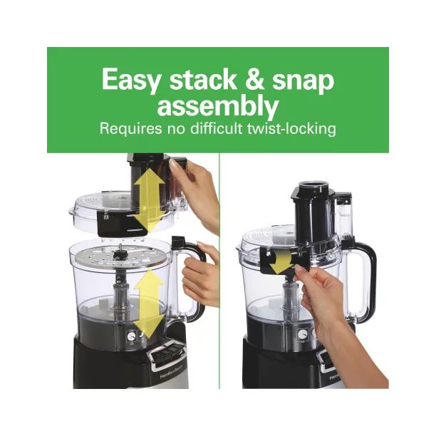 10 Cup Food Processor makes it easy to slice, shred, chop and puree vegetables, cheese, dips, sauces and so much more. The stainless steel reversible disc slices and shreds and the stainless steel S-blade chops, purees and mixes. The Hamilton Beach Stack & Snap 10 Cup Food Processor comes with a 10 cup sealed bowl to prevent messy leaks and its easy stack and snap assembly requires no difficult twist-locking.