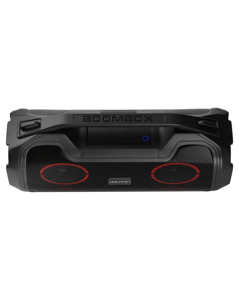 Rechargeable Water Resistant Boombox • Indoor/Outdoor EQ Setting • Po wer Bank Function (5V/1A) • LED Ba ttery Indicator • Dual 5" Diaphragms For a Soft & Punchy Bass • WaveSync™ Technology • Multicolor Woofer Lights • Main Channel: Bluetooth, USB, or AUX • Auxiliary Input: 3.5mm Jack • Dual 3.5" Woofers • Power Output: 40 RMS Watts • Built-In 3600m Ah 7.4V Lith iu m-ion Ba ttery • IPX5 Splashproof Rating