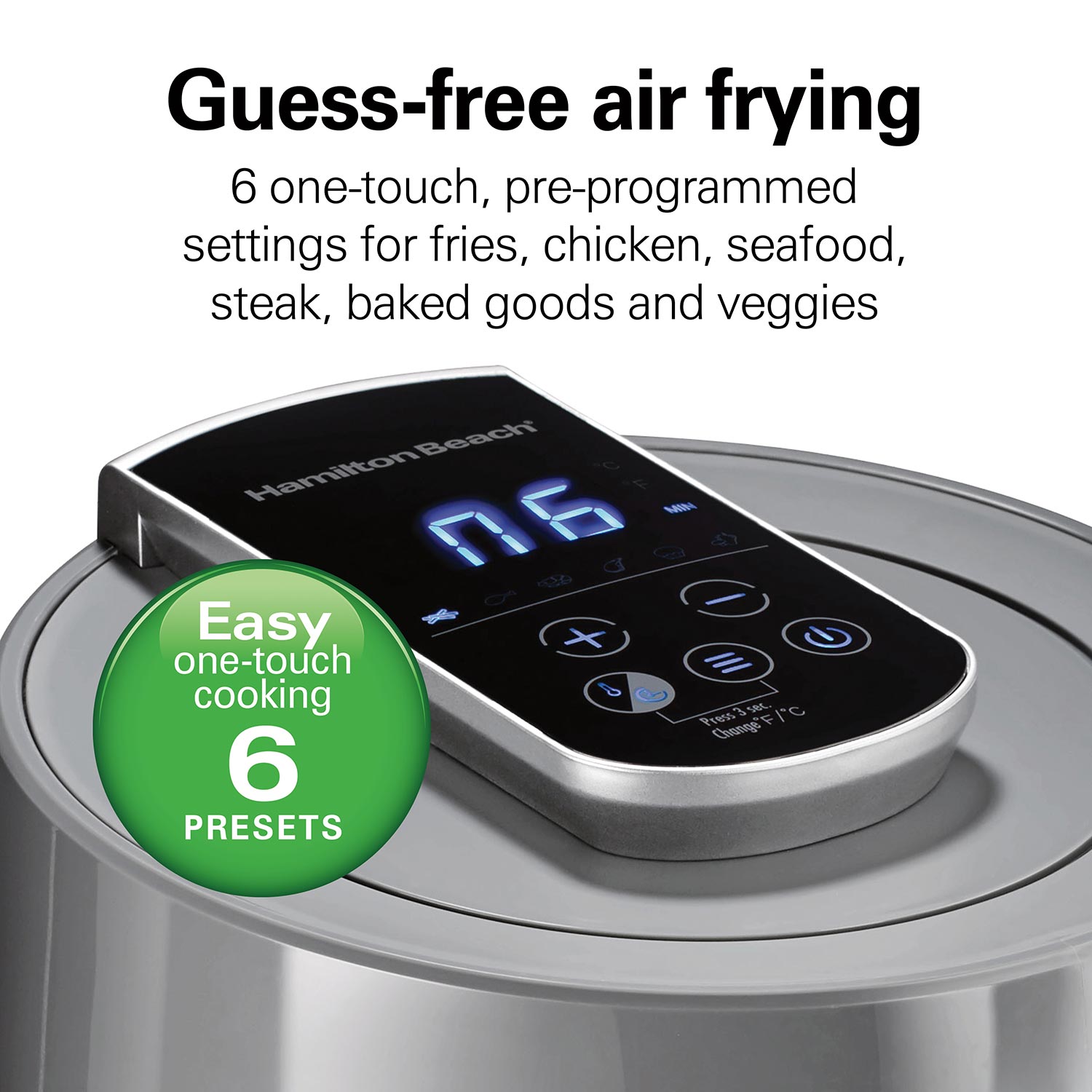 Liter Digital Air Fryer will expertly air fry all your favorites and give you the crispy texture you love with little to no oil. It’s easy to use and no preheating is necessary. Simply choose from 6 one-touch, pre-programmed settings for French fries, chicken, seafood, steak, baked goods and veggies. Your food will cook for the perfect amount of time and when cooking is done, an audible beep will alert you when food is ready. You can also customize air frying by selecting your preferred cooking time and temperature up to 400° F. From quick dinners to midnight snacks, the Hamilton Beach 3.7 Qt./3.5 Liter Digital Air Fryer is the perfect size for feeding up to 3 people. After cooking, the removable nonstick basket and crisping insert make cleanup easy.