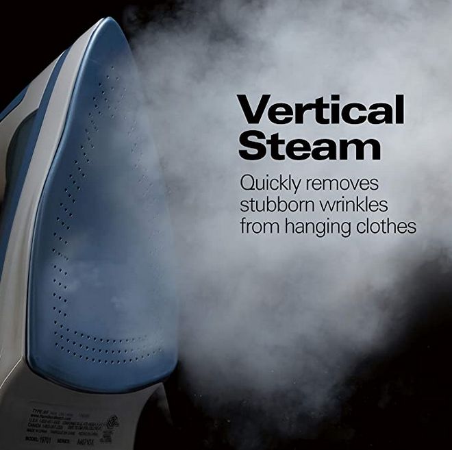 Quick overview: Full-Size Iron has a non-stick soleplate which is 10 times more durable and allows for superior glide performance. This iron has an adjustable steam blast and fine-mist spray. It features an automatic shutoff, which shuts off in 30 seconds if the iron rests on its face or side, or it shuts off in 15 minutes if it rests on its heel. It also has a hot dot indicator which lets users know when the iron is cool enough for storage.