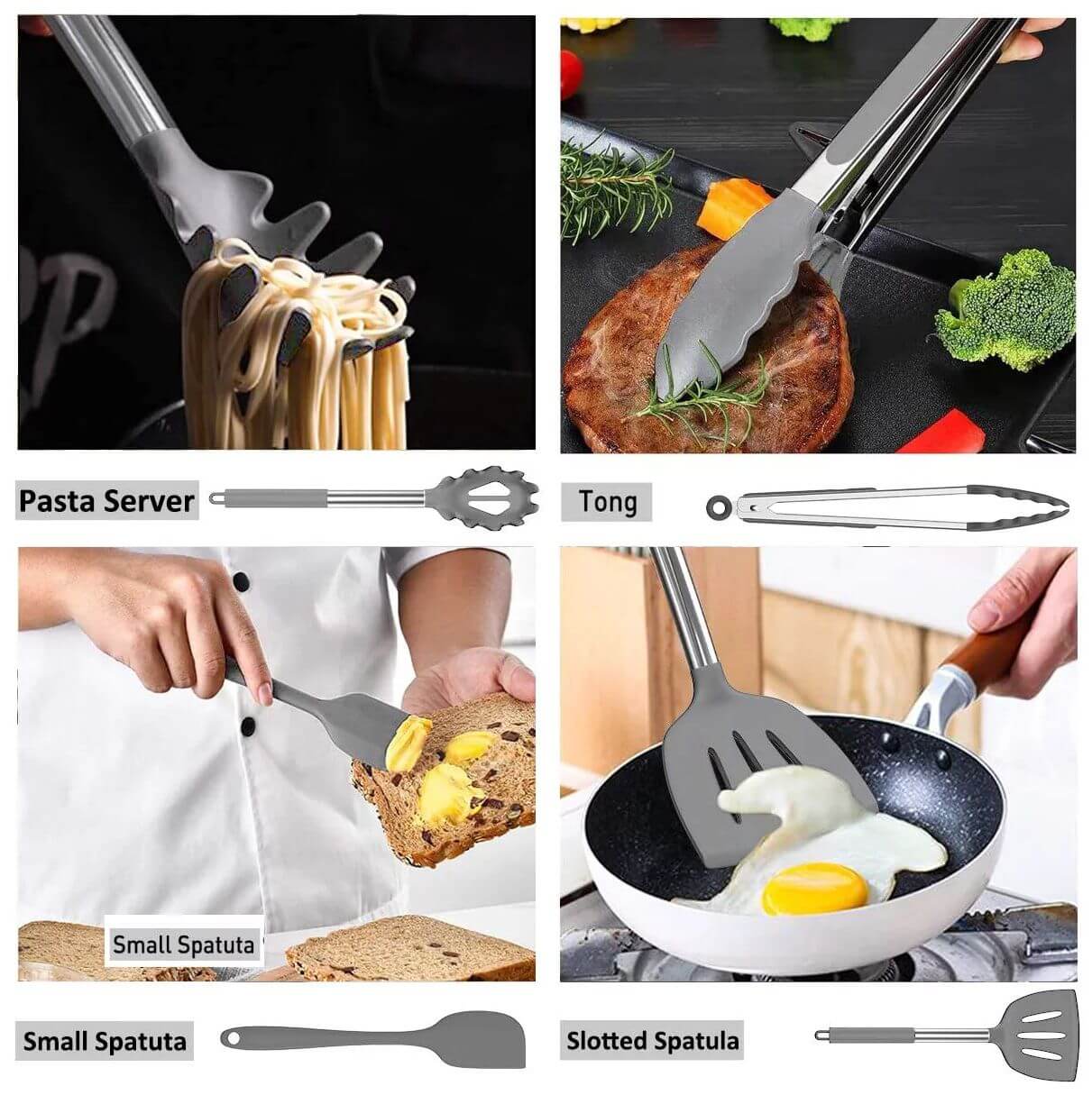 Quick overview: Professional Kitchen Utensil Set: The Kitchen Cooking Utensils includes Spatula Frying spatula Spoon Small spoon Colander Spaghetti Scraper Salad spatula Whisk Food tongs Oil brush Let you feel satisfied for any kitchen needs.