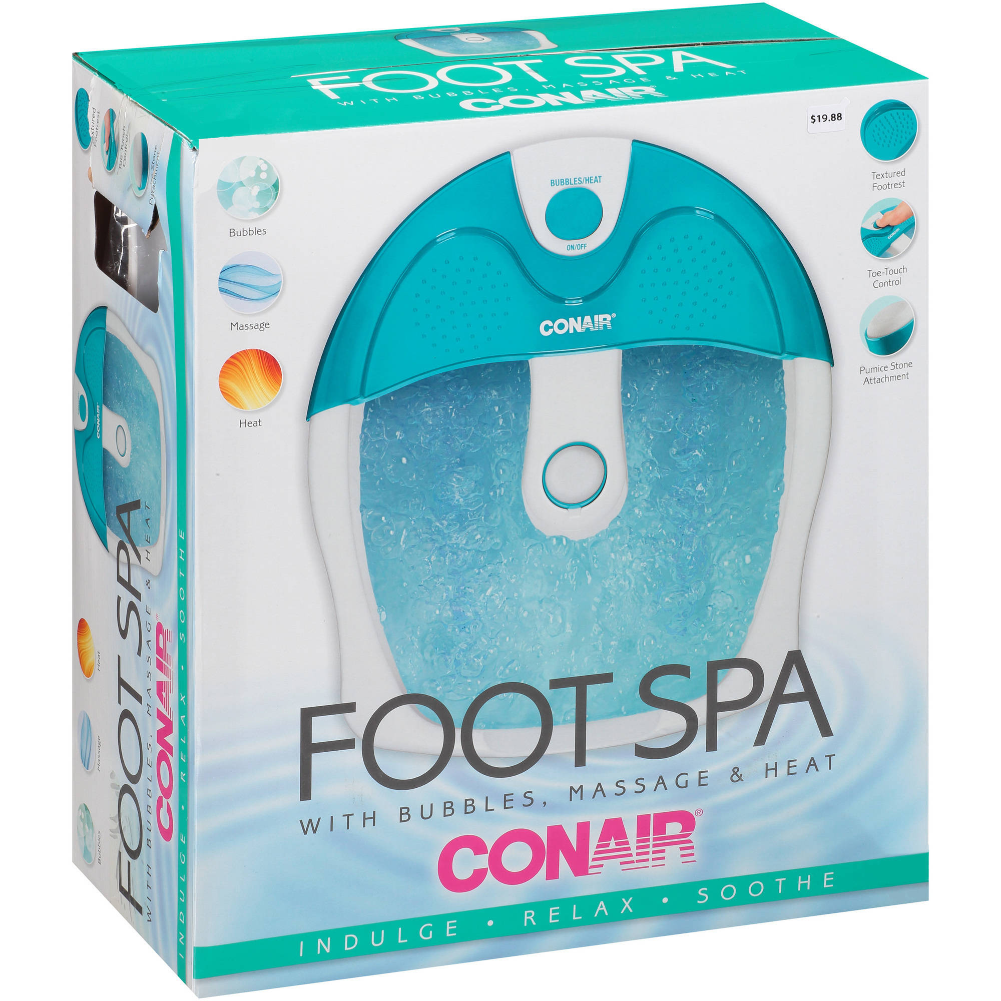 Quick overview: Soothe and smooth your feet with an invigorating soak in the Foot Spa with Bubbles & Massage by ConairCare®. Activate the bubbles with the simple toe-touch control and luxuriate in the spa that stimulates and revives tired, achy foot muscles. Swirling water caresses your feet, easing away tension caused by standing, walking, and exercising. Roll your feet across the rounded nodes on the spa floor or raise them out of the water and onto the textured footrest for an invigorating manual massage that rubs your reflex points for ultimate relaxation. The pumice stone attachment buffs away dry skin, exfoliating your feet and leaving them feeling and looking refreshed and renewed.