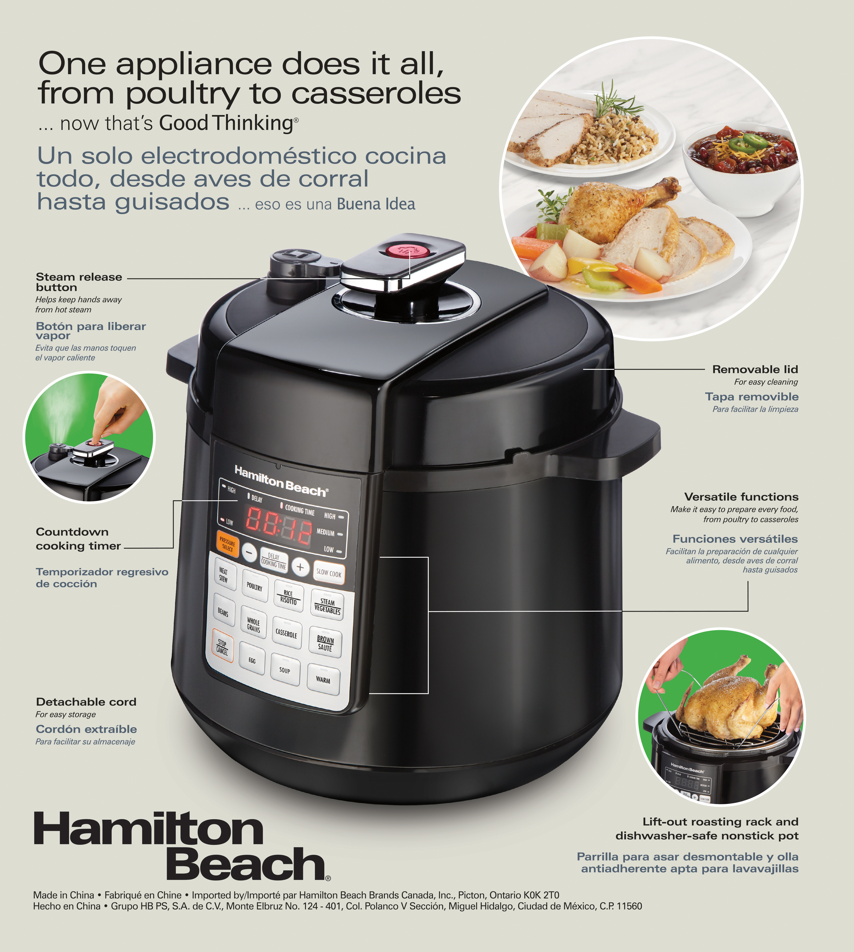 Quick overview: The Hamilton Beach Multi-Function Pressure Cooker with a steam release button safely releases steam away from hands. In addition to fast pressure-cooking, the Hamilton Beach Multi-Function Pressure Cooker has True Slow. technology, which gradually raises the temperature just like a traditional slow cooker to prevent overcooking so that slow cooker recipes come out just right. And it does so much more! Besides pressure-cooking and slow-cooking with confidence, the Hamilton Beach Multi-Function Pressure Cooker is also a rice cooker, steamer, egg cooker, and warmer, plus it sautés. It has preset programs for meat, poultry, rice, steaming, beans, whole grains, casseroles, eggs, and soup.