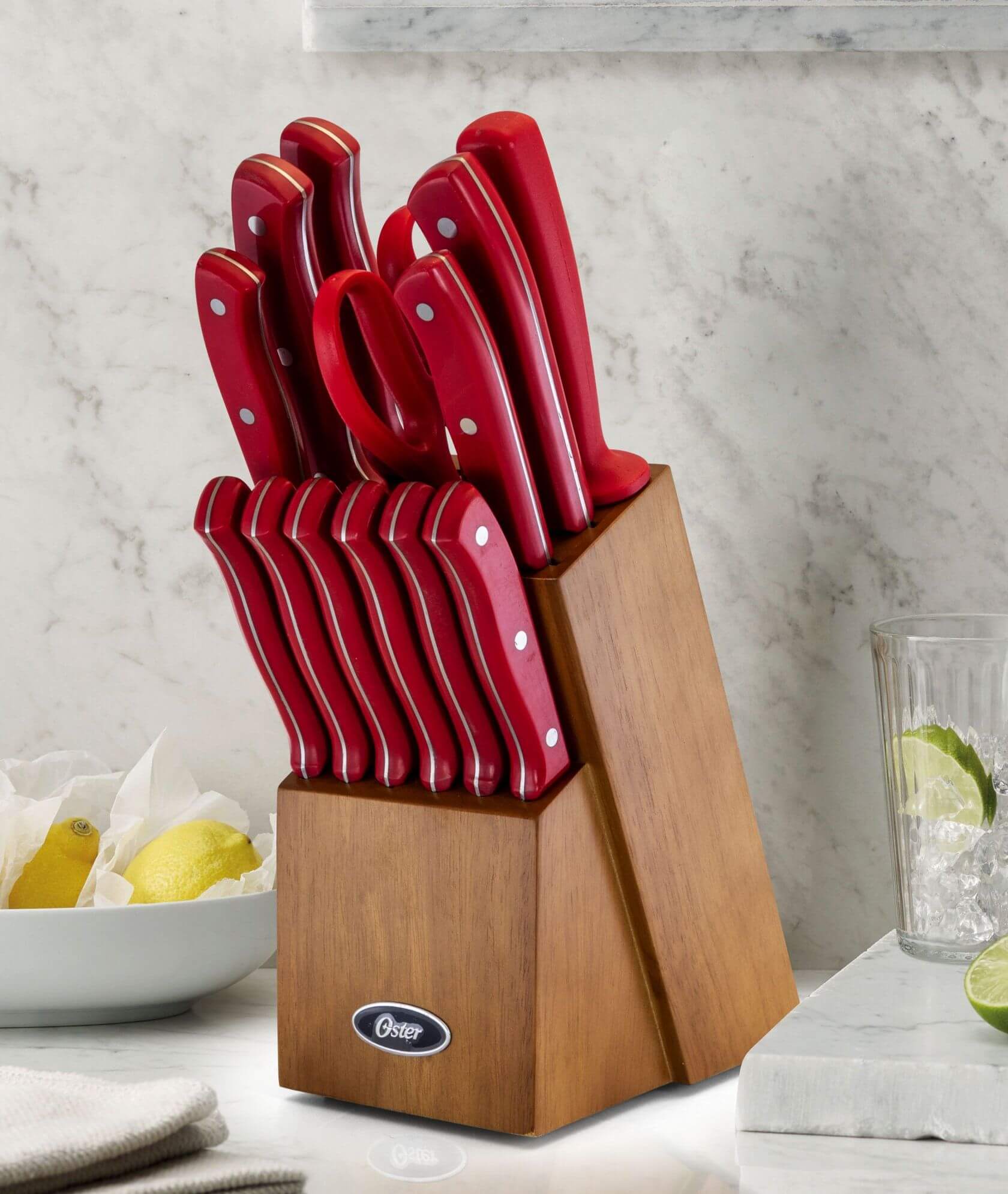 Quick overview: Make sure all your slicing and dicing needs are met with the comprehensive Each piece of this collection boasts precision and durability, and its sleek look is complemented by a beautiful stainless steel finish. It features stain and rust-resistant stainless steel blades and full tang red handles for balance. All pieces are stored in a handy black rubberwood block, adding elegance to your countertop