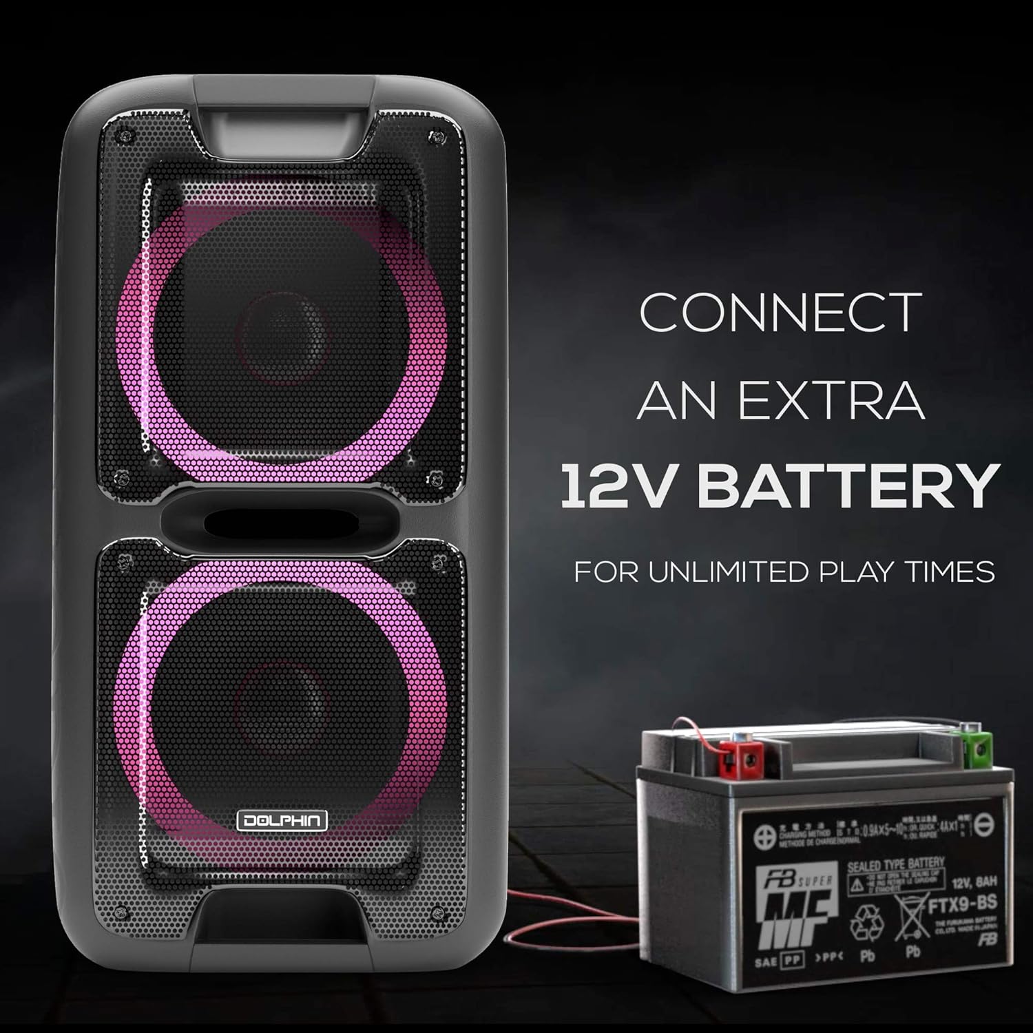 Quick overview: Do not get stuck playing the same old boring party games time and time again. Get the party started with the Dolphin Portable Bluetooth Speaker. The portable speaker features dual 10-inch woofers with strong magnets for a solid bass-thumping sound. Enjoy true Bluetooth wireless connectivity by streaming your favorite playlist through your smartphone, tablet, or computer. The built-in rechargeable battery allows you to play music for up to 7 hours, and you can extend that time by charging on the go by connecting it to a 12V battery. Connect your devices from other ways as well, for the speaker also includes USB and SD Mp3 Players, and FM Scan Radio.