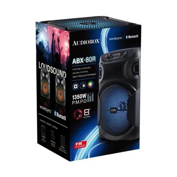 Quick overview: The Audiobox 8-Inch Portable PA Speaker features an 8 in. driver for solid sound performance. The built-in rechargeable battery keeps the party going all day long. Once the sun sets, light the night with the 7-color woofer light show. Wirelessly stream music from any Bluetooth source, downloads on USB/SD media, or the built-in FM tuner.