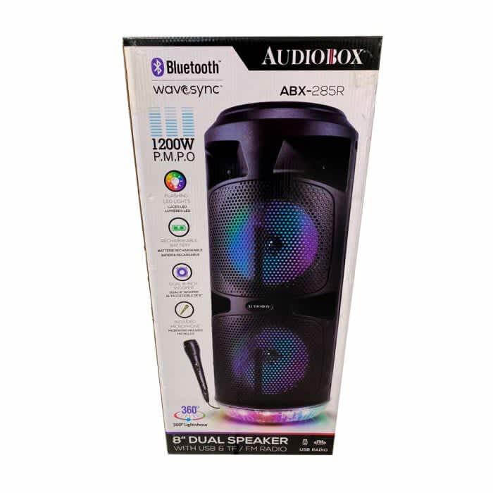 Quick overview: The ABX-285R Bluetooth Rechargeable Speaker from Audiobox packs a whole lot of party entertainment into its 23 in. tall tower. Dual 8 in woofers pump out up to 1,200 watts of musical power! 360deg light effects and included wired 1 4 in. microphone means you can add excitement to your own singalongs. Other inputs include Bluetooth streaming, FM radio, 3.5 mm aux for non-Bluetooth devices, and USB microSD Card slots for your own media with MP3 files.
